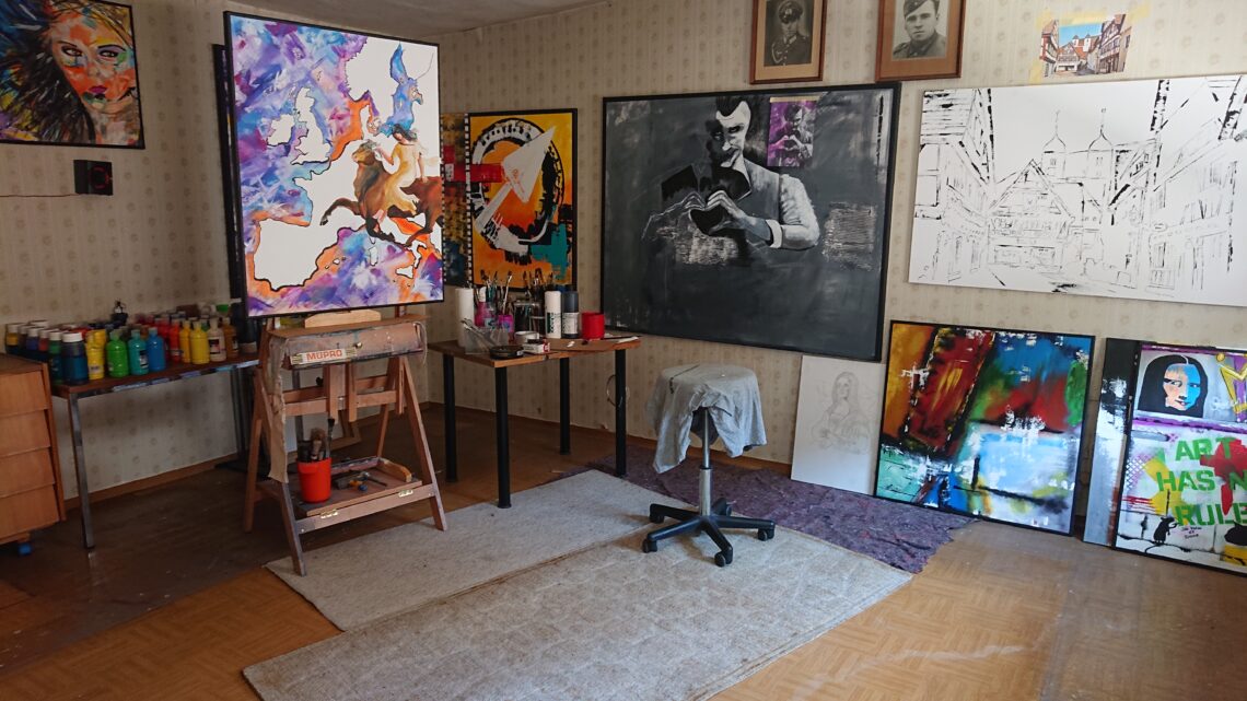 So perhaps I’m one of the few people who can leave everything behind without anyone being bothered by it. I can easily hang finished paintings on the wall to dry, since the rooms on the upper floor also measure 80 square metres. The kitchen at that time still offers the possibility to clean the utensils.