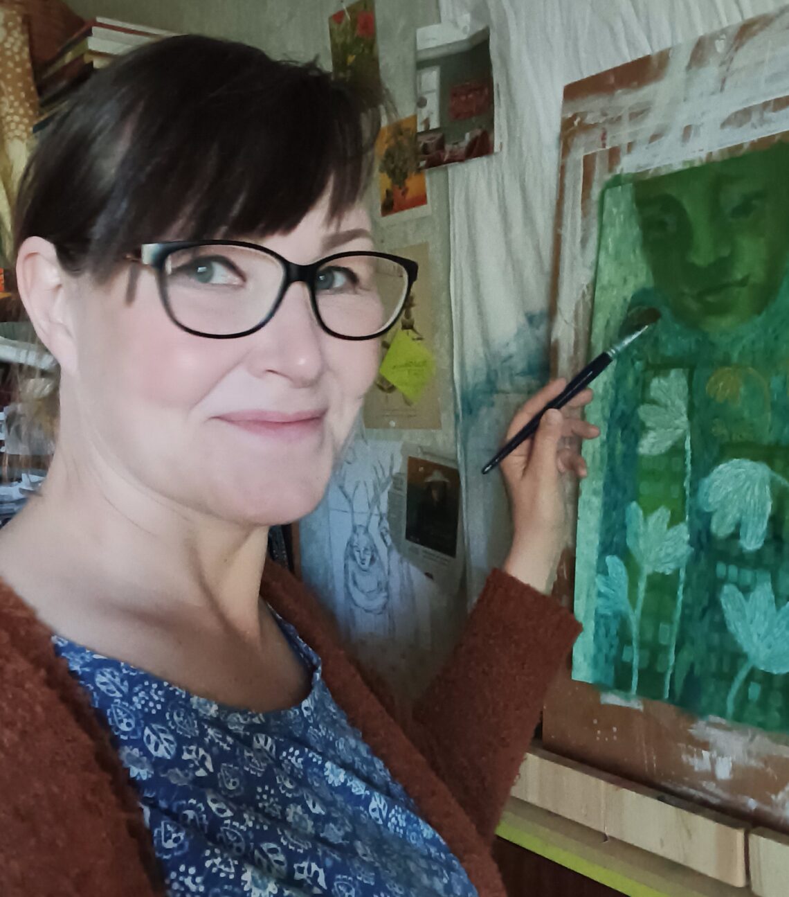 In addition to being an artist, I’ve had another career in mental health and substance abuse work as a cognitive therapist. Each person of us has his/hers own history, each of us is vulnerable, sometimes lost and close to losing hope altogether. With my paintings, I want to tell you about hope and compassion, finding your own way and daring to live. In concrete terms, my life came to a standstill when I received an aggressive breast cancer diagnosis in 2019. I decided not to give up. While I’m telling other people’s stories, I’m telling and painting my own story too. I hope it’s conveyed by my works. – Humanity, authenticity and presence.