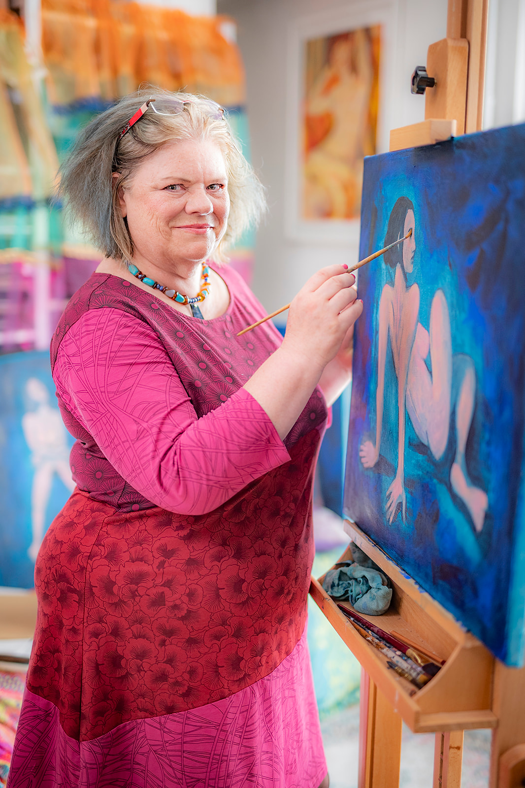 I am interested in the figure, in nudes and portraits, but also in animals and angels. I can’t say exactly what fascinates me so much. To a large extent it is the shapes and colours of the figures as they present themselves to me. I like to stylise them. But on another level, I try to capture the essence of people, to make them visible, the soul and expression of people, animals and angels with all their contradictions that cannot be put into words. Another theme I have dealt with, especially in digital images, is sacred space and the figure in sacred space. I think exciting things can still develop here.