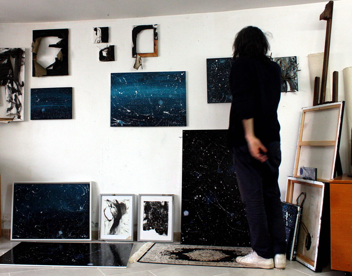 My atelier is the place that houses my works but also the place where I live and spend most of my time. It is small and simple, mostly inhabited by artwork, musical instruments and books. Â